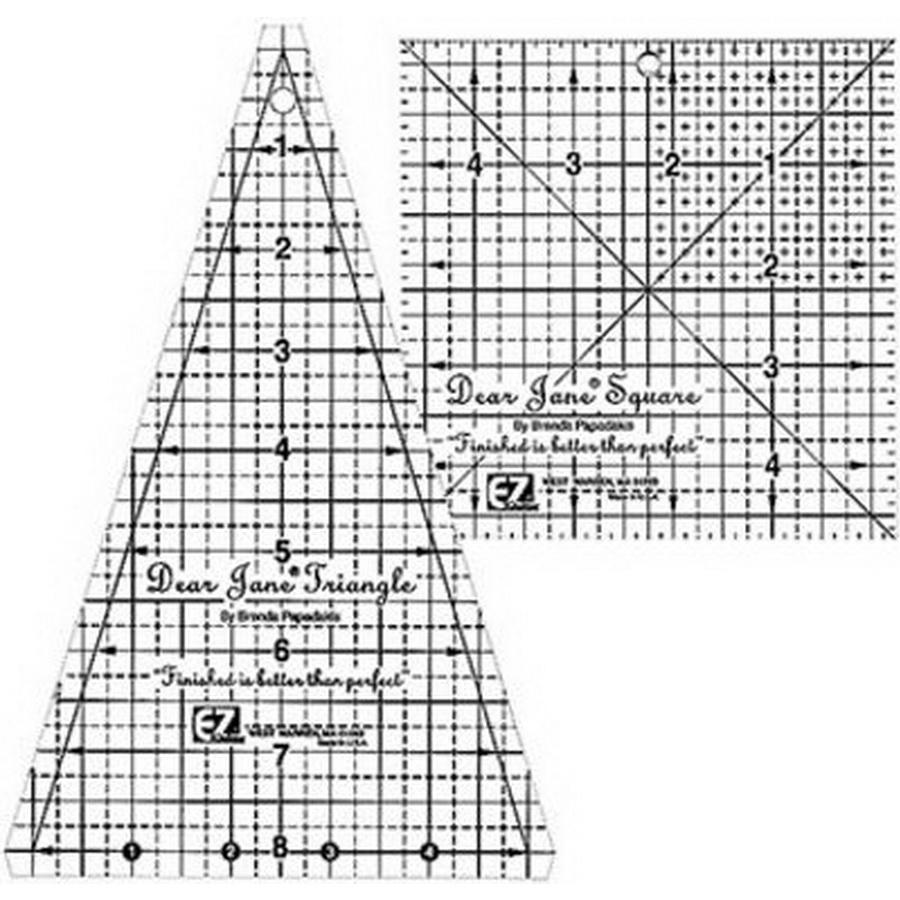 Includes Dear Jane Triangle and Square rulers with easy to read big number design and built in 1/4in seam allowance. Use with the Dear Jane quilt book (8987) by Brenda Papadakis. Set of 2 templates.