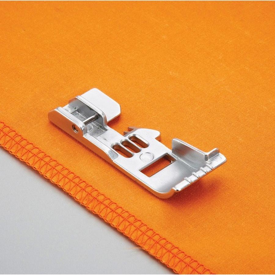 The serger has the convenience of a snap-on presser foot. The raised markings on the toe of the foot are seam line guides. They indicate the needle positions to help guide your fabric for accurate seaming.