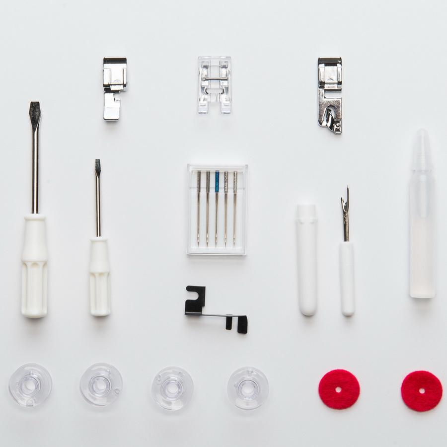 The HD-1000 Black Edition comes with bonus items including an Ultra Glide Foot; Leather needle set; Even Feed Foot; Anna Maria Horner sticker decals as well as a hard machine cover.
