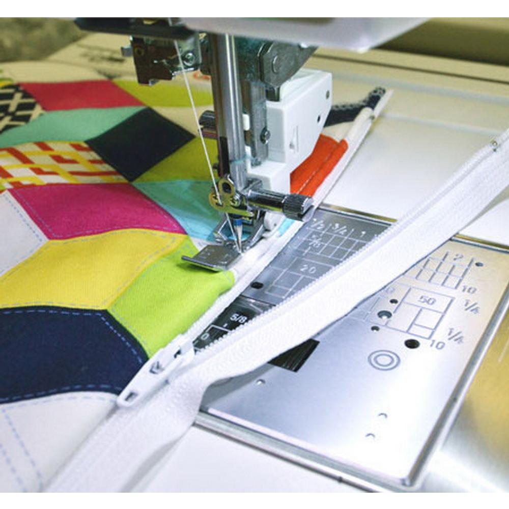 The foot can be set to sew on each side of the zipper. The edge of the foot guides the zipper to ensure stright placement. The AcuFeed mechanism is great for zippers in thin or stretchy fabrics; it feeds all the layers through evenly for a polished look. Use with AcuFeed Holder Single.