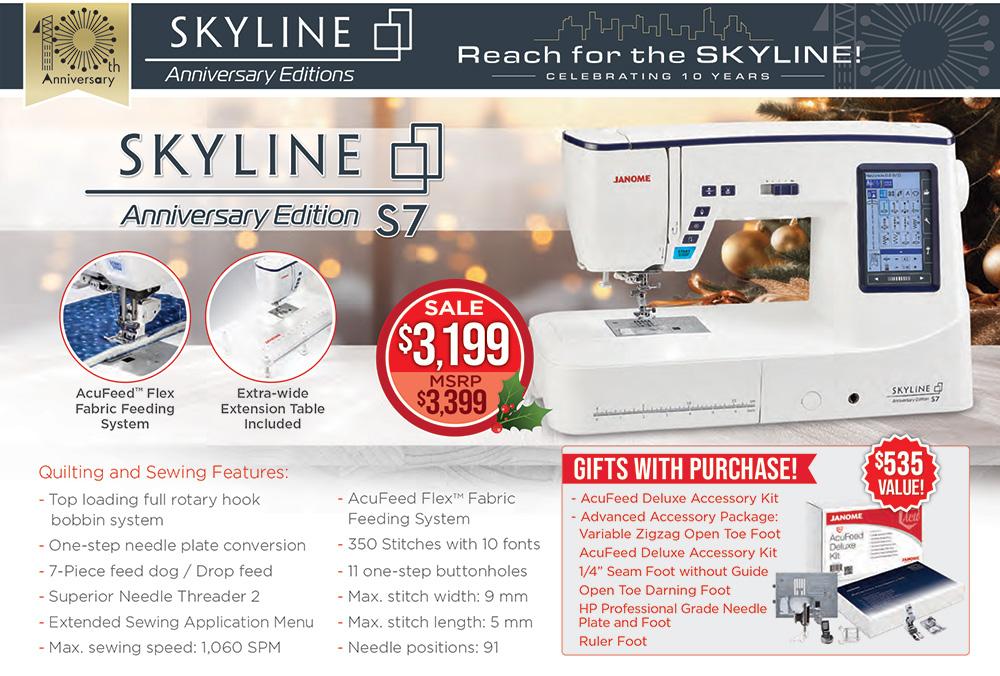 Janome Skyline S7 Anniversary Edition Sewing & Quilting Machine FREE HOLIDAY BONUS PACKAGE VALUED AT $535.00 - EXPIRES 12/31/2025!