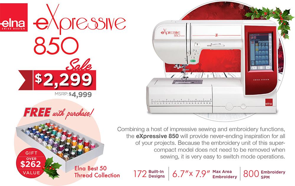 Elna eXpressive 850 Sewing and Embroidery Machine FREE HOLIDAY BONUS PACKAGE VALUED AT $262.00 - EXPIRES 12/31/2025!