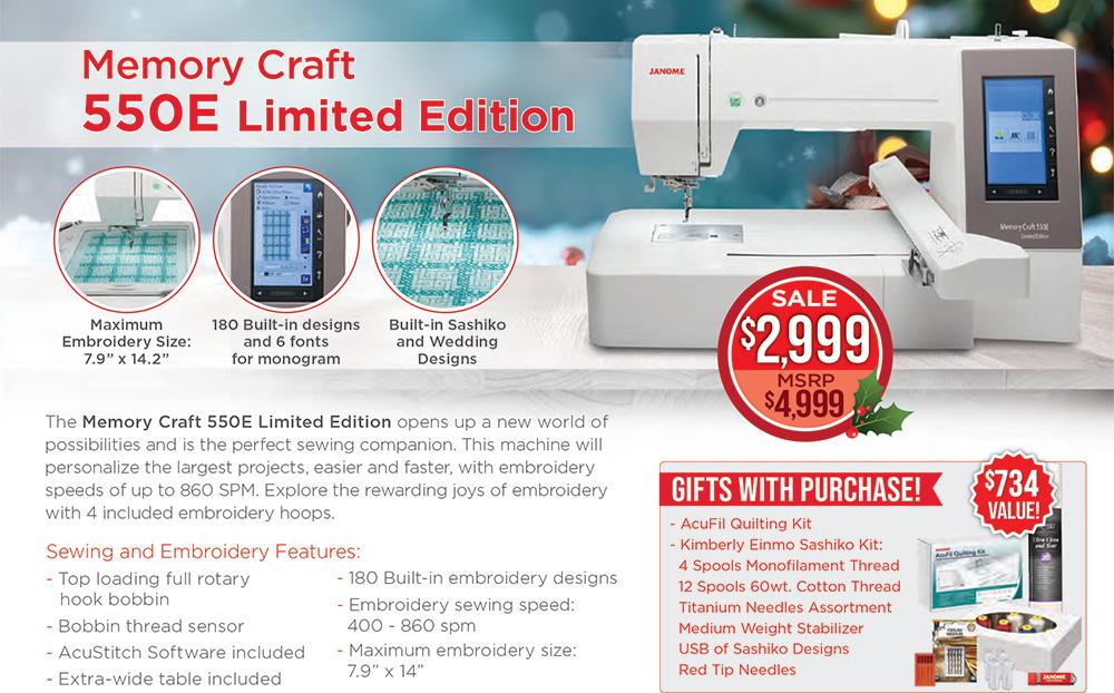 Janome Memory Craft 550E Limited Edition FREE HOLIDAY BONUS PACKAGE VALUED AT $734.00 - EXPIRES 12/31/2025!