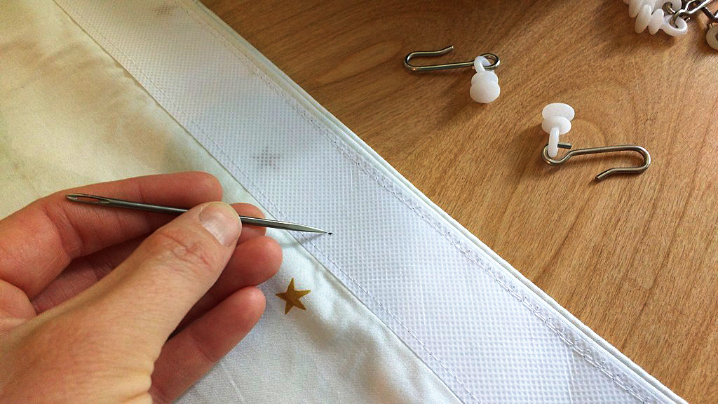 Now it was time to puncture some holes in the drapery tape so I could add the hooks that feed into the curtain tracks. For this, I used my handheld sailmaker needles to pierce a hole in the tape but not through to the front of the fabric.