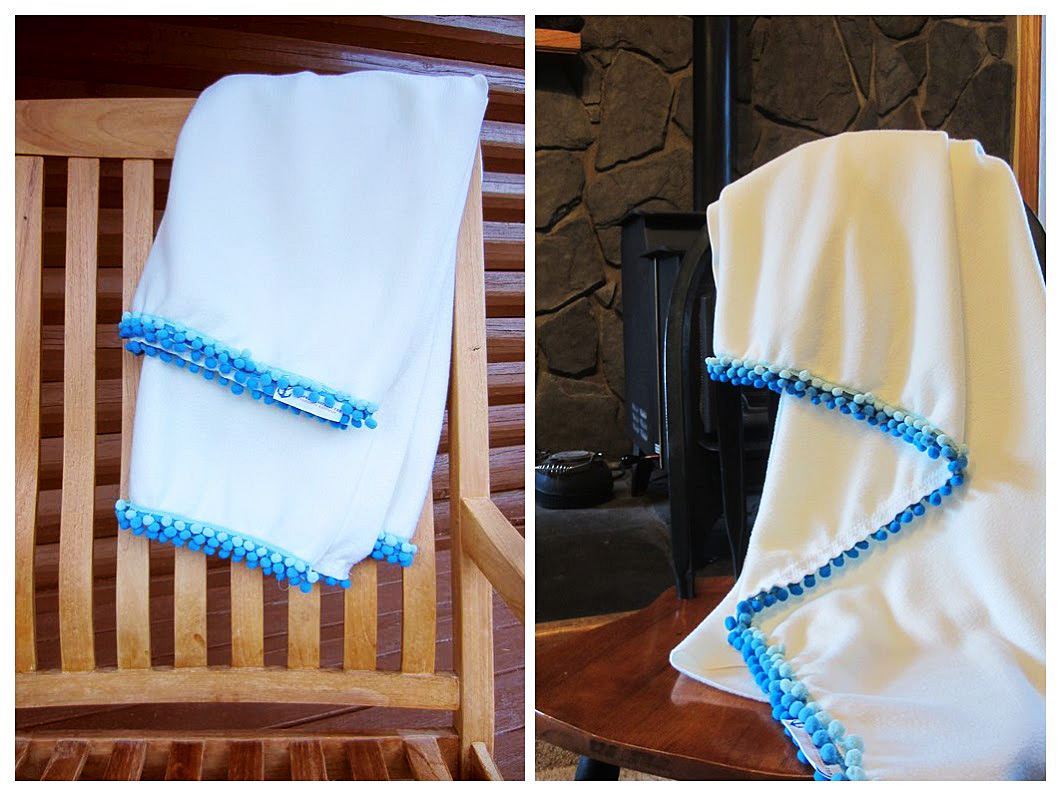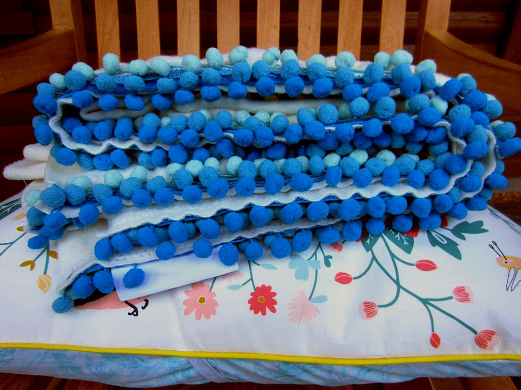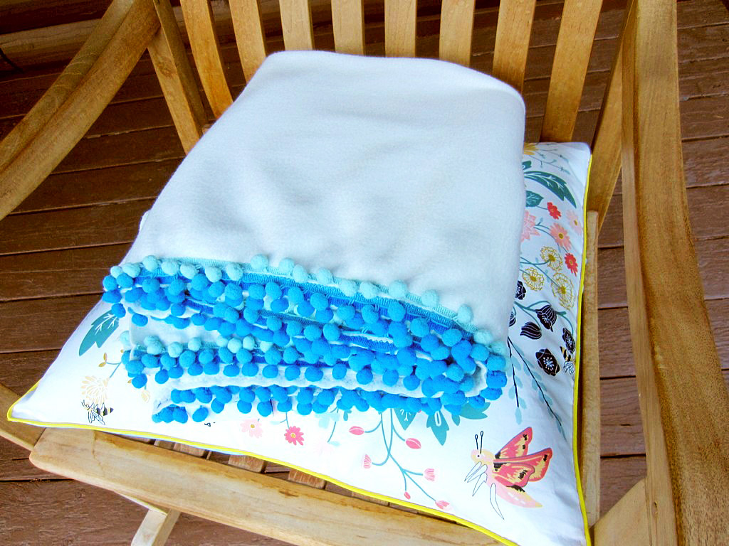 I used some trims I had on hand, a velvet green ribbon, a red fleece ribbon and some white satin binding to close everything up.