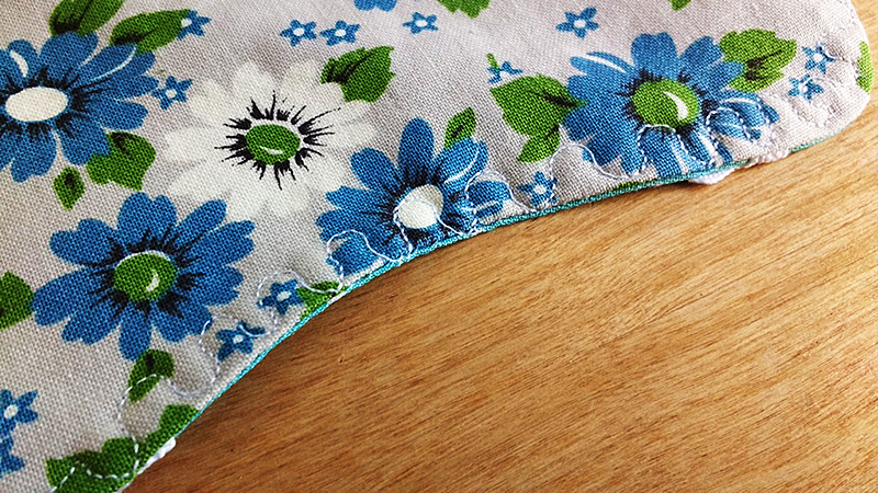 Here’s how mine looked after sewing all the way around. I trimmed away the excess fabric and made small snips around the inner and outer curves so they would lie flat once I turned the fabric right sides out.