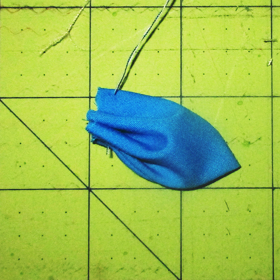 Sew a long running stitch through all four layers of the curved edge. Then pull the thread taut to gather the petal and repeat with the next petal. After you have sewn and gathered five petals, pull thread to tightly gather and sew the last petal you gathered to the first one of the five.