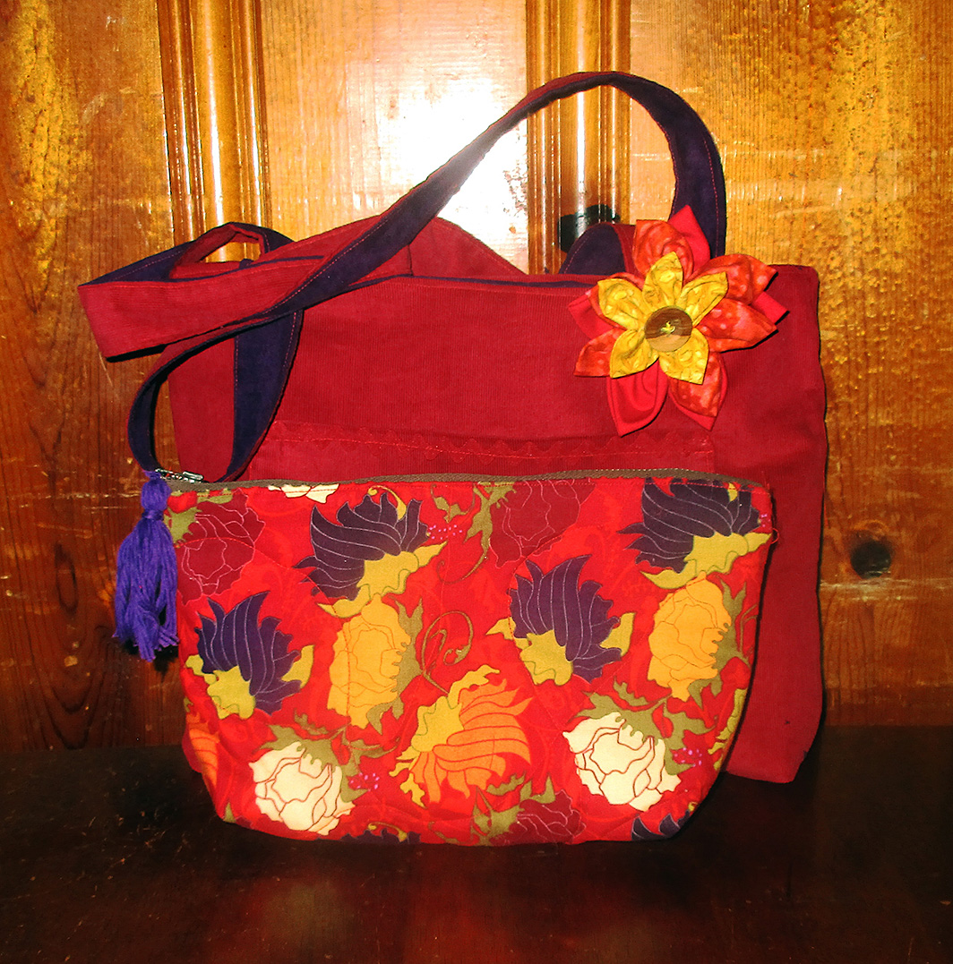 I wanted to make a fabric flower pin to dress up and bring together the complementary colors on a reversible tote bag I made for my mother-in-law’s Christmas gift.